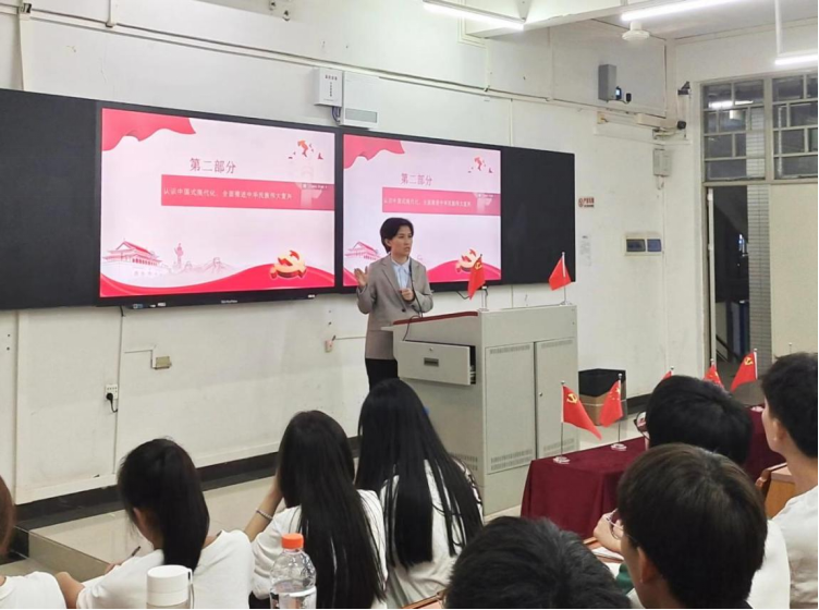 赵老师从“学习二十大”“理解中国式现代化”“你心中的中国青年”三个方面进行了分析阐述。她首先从二十大报告的标题谈起,过渡到中国式现代化,指出“中国式现代”是我们国家特有的社会主义现代化,它既有各国现代化的共同特征,更有基于自己国情的中国特色。授课中,赵老师通过讲授历史发展的事件,简要阐述了现代化的含义、历史进程、为什么走“中国式现代化”、现代化的发展模式四个方面,让同学们有了更加深刻的了解。接着赵老师从党的二十大报告擘画了以中国式现代化全面推进中华民族伟大复兴的宏伟蓝图,明确提出了人口规模巨大、全体人民共同富裕、物质文明和精神文明相协调、人与自然和谐共生、走和平发展道路五大显著特色。