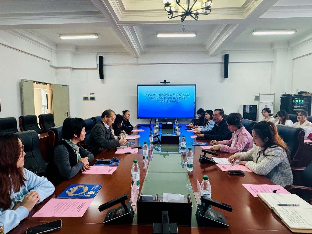 许典榕对潘汉荣一行的到访表示热烈欢迎,赵玲霞对学院近年来中高三二分段合作情况作了介绍。潘汉荣和南沙岭东幼儿保育专业教研组组长陈晓敏详细介绍了南沙岭东专业建设、办学特色和成果。双方还就下一步在课程衔接、成果培育等方面的合作进行深入研讨。