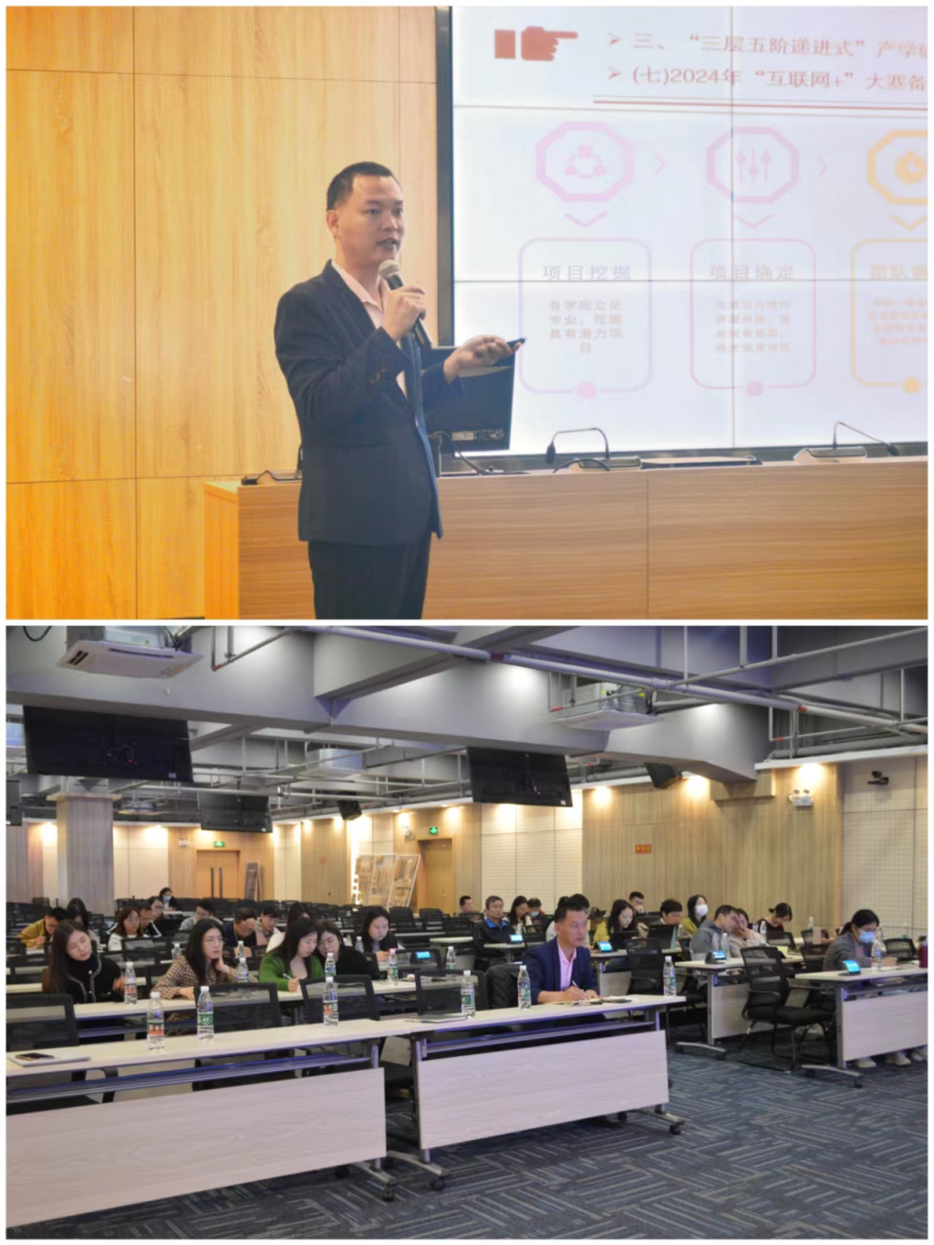 黄品老师从学校党委印发的 《铸魂逐梦工程——新时代9999js金沙老品牌学生工作高质量发展行动方案(2023-2025)》出发 ,强调“用劳模精神感召人、用劳动精神培养人、用工匠精神铸造人”的特色育人理念,围绕“三层五阶递进式”产学研育——高职院校创新创业教育高质量发展的路径探索”为题展开分享。分享从回顾“南华创新创业教育1.0(2019-2022) ‘五阶递进式’学研育”进行总结分析经验,探索“南华创新创业教育2.0(2023-2025) ‘三层五阶递进式’产学研育”实施路径,呼吁参会教师积极参与到学校创新创业教育事业,在学校创新创业教育事业高质量发展中长才干、做贡献。同时会上还与老师们分享了“互联网+”“挑战杯”等大赛备赛参赛经验,鼓励老师们积极参赛。