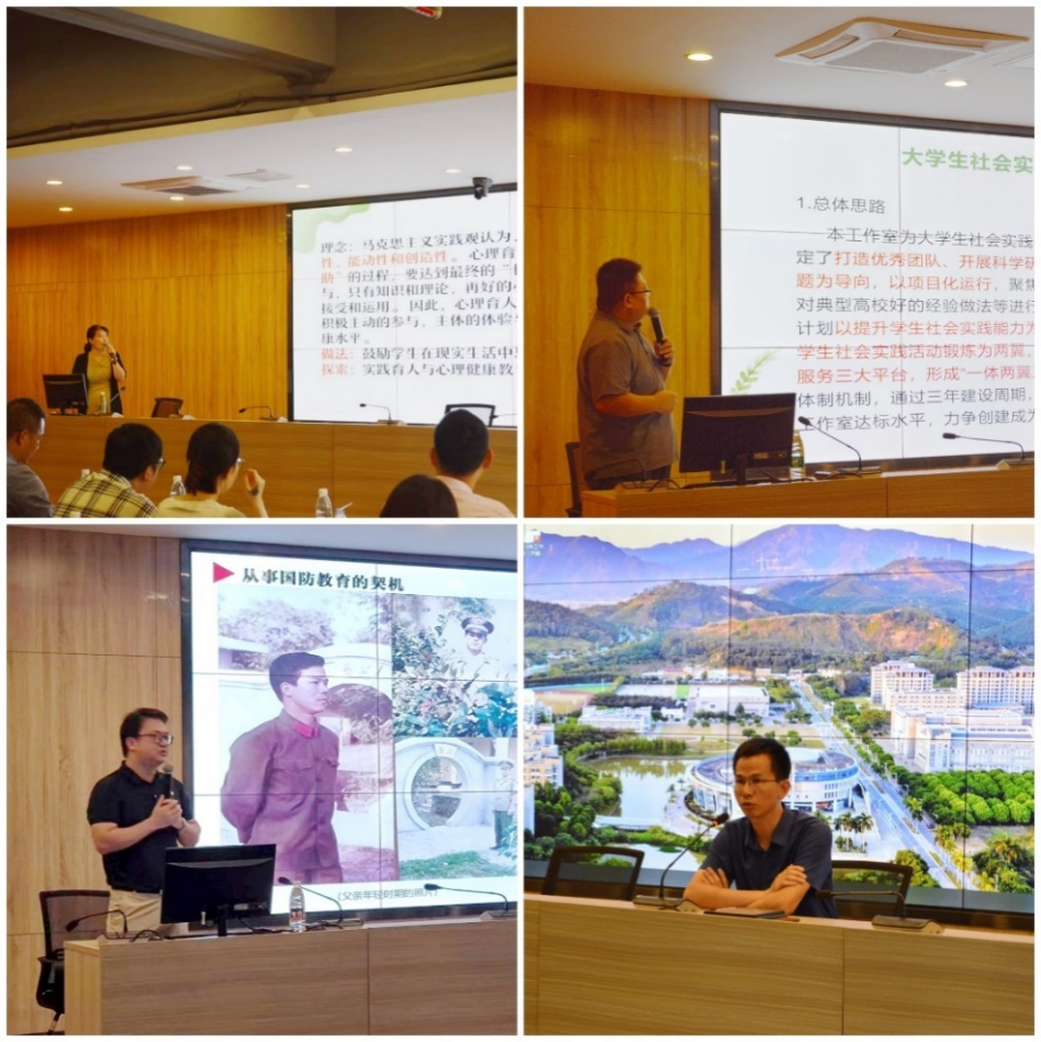 活动中,“护心、筑梦”辅导员工作室、“大学生国防教育与征兵”辅导员工作室、“大学生社会实践指导”辅导员工作室的主持人分别介绍了工作室建设情况、成果成效、不足和建设心得。章小剑老师表示后续将按照实践与心理协同育人方向,继续立足工作室建设实际,进一步加强工作室的规范建设、成果凝炼探索;杨力铖老师通过个人成长经历、实践与摸索以及戍边烈士的故事展开,呼吁大家今后进一步加强对大学生进行国防教育,培养大学生的责任感和使命感;邱伟波老师详细介绍工作室成员参与竞赛与活动的情况,并详细分析建设过程中存在的问题与解决措施,并表示将在优化团队人员配备、提升平台软硬件设备及竞争省级骨干辅导员工作室上继续努力。