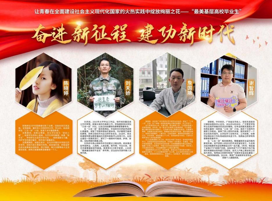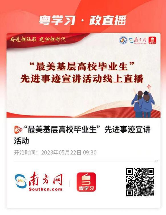 为深入贯彻习近平总书记关于青年工作的重要思想,引导和鼓励 高校毕业生到基层一线建功立业,广东省人力资源和社会保障厅拟定 于 2023 年 5 月 22 日 (星期一) 上午 9:30 在华南理工大学大学开展“最 美基层高校毕业生”先进事迹宣讲活动,活动将由南方网全程直播。请各二级学院组织发动在校学生自行观看或集中收看活动直播,并于 5月 22 日下午下班前将学生观看活动的照片 (精选 3-5 张) 发送到曾妍 老师邮箱:zengyan@nhic.edu.cn,具体人物简介和直播网址请见附件海报。