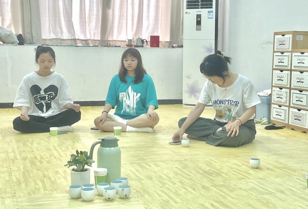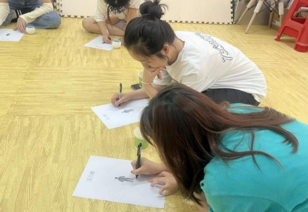 在沙龙活动中,同学们通过自我介绍逐渐熟悉起来,通过“背靠背站起来”小游戏,大家互相之间对压力有个直观的感受。通过卢老师带领大家喝茶、静坐、观呼吸,同学们把注意力回到自己身上,慢慢地放松下来。同学们通过画压力圈表达自己近期感受到的压力,并轮流分享压力事件和感受,心理中心的卢老师和刘老师进行及时地回应与引导,其他同学也给予了建议和支持。