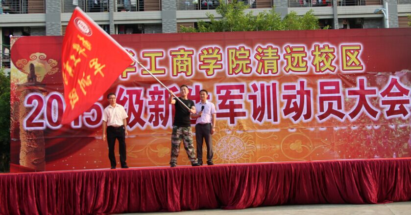 院长助理、清远校区综合办韦秀华主任代表学院授军训团团旗
