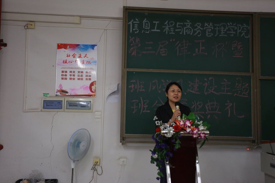 为了提高我院同学们的纪律意识,促进信息工程与商务管理学院班风学风建设,营造良好育人环境。为此信商学院于2018年12月5日晚7点在教学楼405举行信息工程与商务管理学院第三届律正杯暨班风学风建设主题班会颁奖典礼,以弘扬纪检正气,塑造优良校风。信商学院党总支副书记凌红老师、信商学院崔宁老师、翁洁洵老师、梁晓允老师、赖志聪老师、王奕老师出席了本次颁奖典礼。
