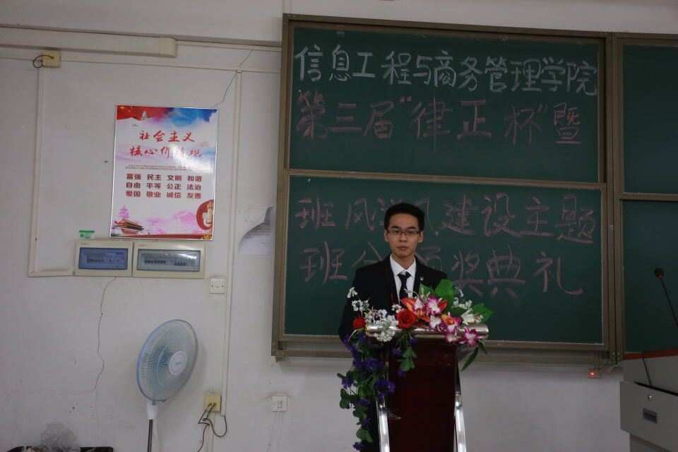 在主持人热情洋溢的致词下,令人期待已久的“律正杯”颁奖典礼拉开了帷幕。首先由检部部长萧子轩发言。他对上一年度的纪检工作进行了总结,并表示要完善各项工作制度,不足的地方及时改进,继续为提高信商学院的班风学风建设而努力。