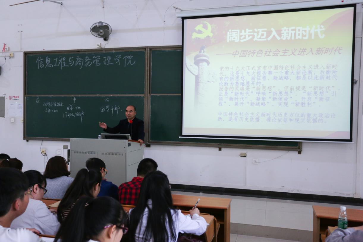 此次李新书记的授课主题为“不忘初心跟党走,青春践行十九大”。李新院长从阔步迈入新时代,弄潮儿向涛头立,万山磅礴看主峰,直挂云帆济沧海切入,向学生深刻细致的剖析了新时代、新使命、新思想和新征程。课堂上李新书记谈到说习近平总书记说:实现中华民族伟大复兴,是近代以来中国人民最伟大的梦想,我们称之为“中国梦”,基本内涵是实现国家富强、民族振兴、人民幸福。这个梦想,凝聚了几代中国人的夙愿,体现了中华民族和中国人民的整体利益,是每一个中华儿女的共同期盼,作为青年的在座的各位老师和同学一定要有理想、有本领、有担当,为中国梦而努力奋斗,同时一定要更加坚定理想信念,勇做时代的弄潮儿,在实践中放飞青春梦想。
