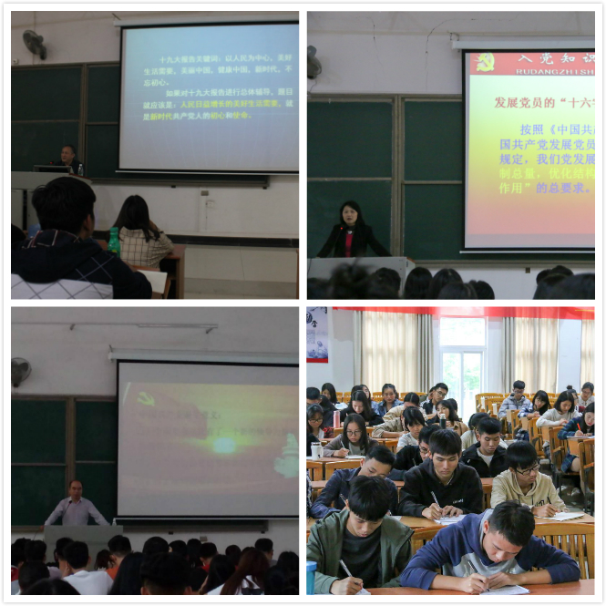 2017年 11月17,18日党课由党委副书记郭记中教授和信商党总支凌红副书记主讲,郭记中教授围绕“新方位、新使命、新要求”三个方面开始了此次党课培训的内容。第一方面“新方位”结合十九大主题和精神,回忆了党的发展历史和奋斗历程,国家从自立到自信的过程,深刻认识到中国发展速度快,人民生活水平提高,与时俱进,要提高文化自信,更加激励了入党同学的积极性以及爱国热情。第二方面“新使命”讲述中国共产党始终不渝走和平发展道路,为实现中华民族伟大复兴作出努力。第三方面“新要求”中国共产党作为世界第一大党,中国特色社会主义进入新时代,我们党一定要有新气象新作为。郭记中教授也提出入党同学要以坚定理想信念宗旨为根基,以共产党人为奋斗目标,深刻了解党的方针政策,要在思想上、生活上、组织上、作风上对自己提出更高的要求,自觉履行党章规定的各项义务,积极投身于实践。