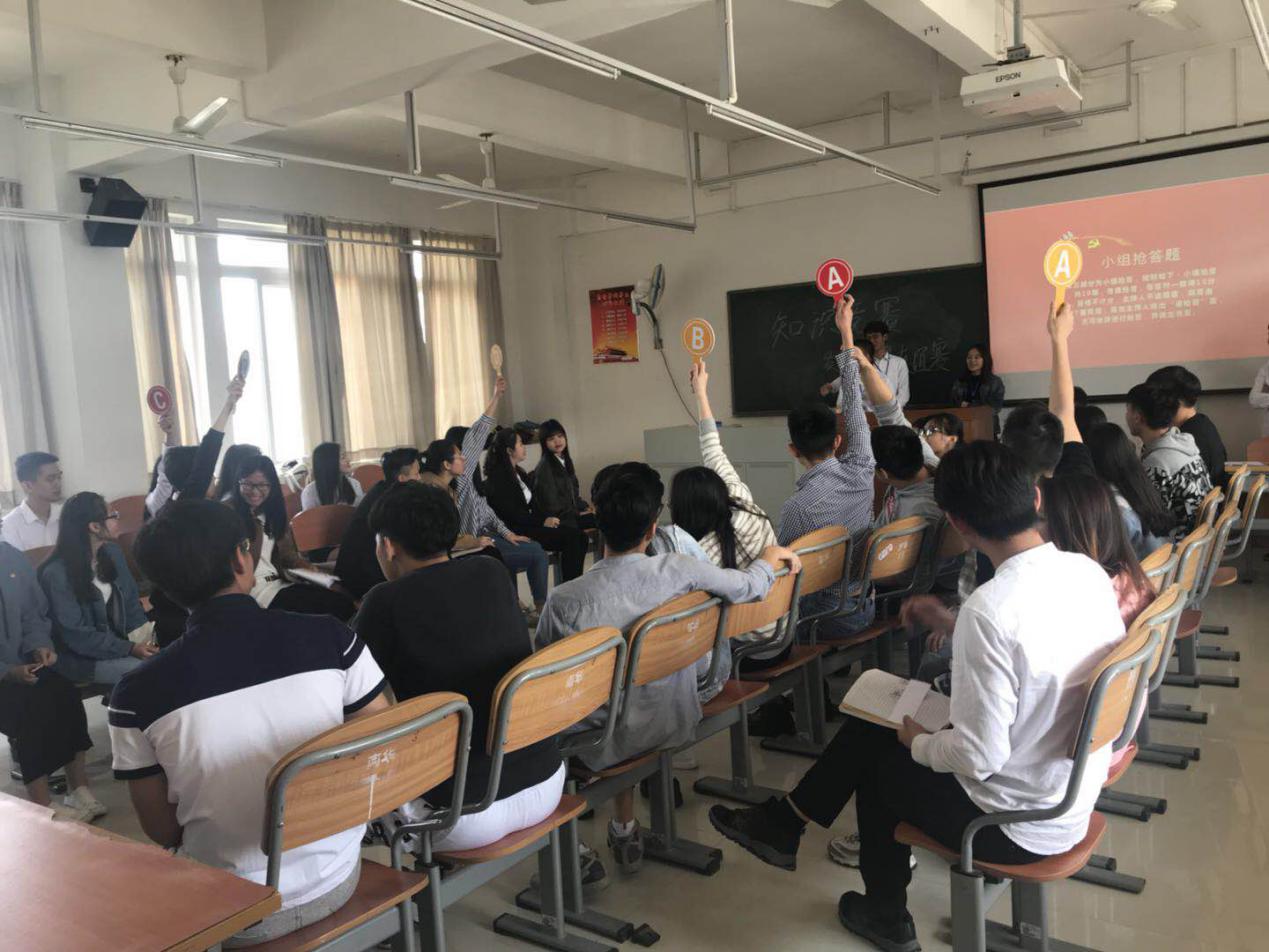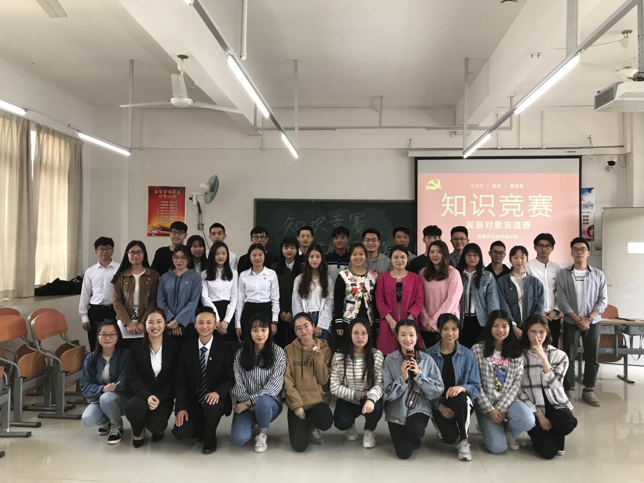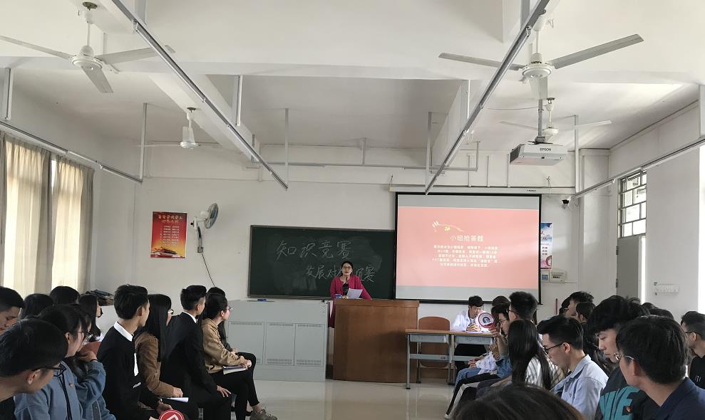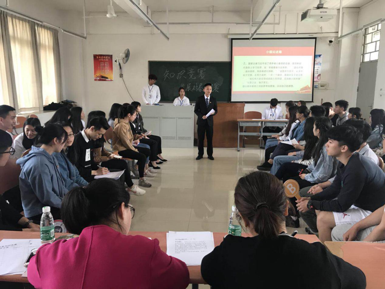 2018年4月17日中午,信息工程与商务管理学院党总支学生党支部在清远校区教学楼507举办了一场“学习十九大,履行新使命”为主题的知识竞赛。本次参赛队伍来自信商学院党总支学生党支部“先锋服务联盟队”全体成员。党总支组织委员、学生党支部书记章小剑、副书记袁小梅担任知识竞赛评委。