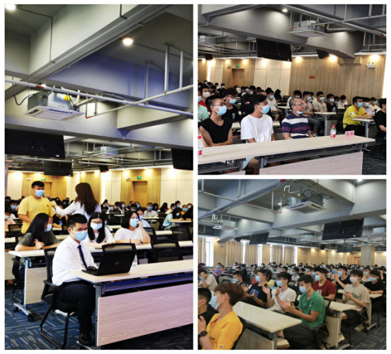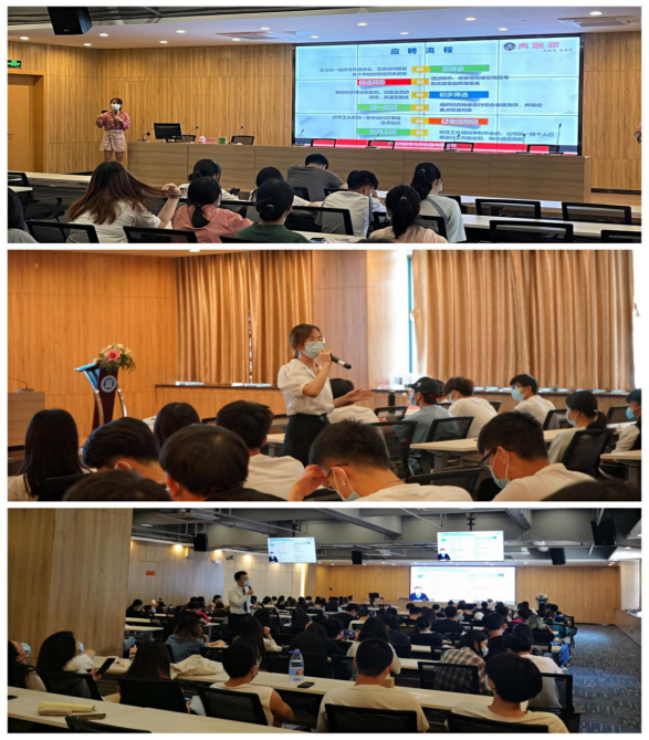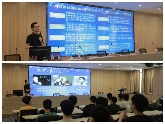 帆,广州肉联帮食品有限公司行政人事部经理李梦思等四家企业通过视频宣传、PPT展示以及回答学生问题等方式就其各自公司发展情况、职工薪酬福利、个人发展前景、订单班培养形式等方面做了详细的宣讲。作为全球领先的综合通信解决方案提供商,中兴通讯股份有限公司王经理向信息技术系的学生展示了企业的优势,企业发展前景以及订单班学生能在企业获取到的知识,同时也分享了很多成功在企业发展起来的优秀毕业生代表案例。优秀毕业生代表温海涛分享了自己毕业这一年来在企业的成长和蜕变历史,作为20届毕业生, 他表示这一年在企业是跌跌撞撞走过来,如果他在校期间有订单班的招聘,相信他的路会比现在走得平坦和顺利,希望学弟学妹们珍惜现在的机会,做好自己的人生规划,不给未来留遗憾。