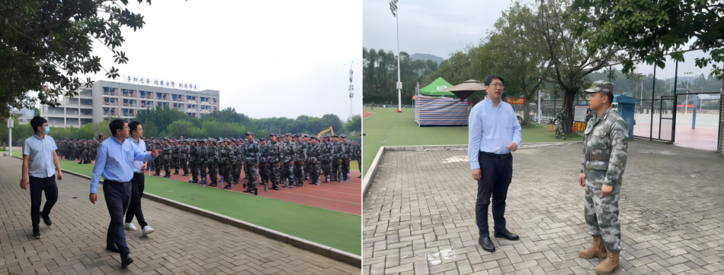 在军训现场,郑海清副书记实地了解军训工作安排和进度,并表示学院时刻关注着参训学生动态,及时了解并全力解决训练过程中遇到的困难。郑海清副书记讲到,军事训练可以提高学生的国防意识、增强学生的身心素质,同学们在训练中不怕苦不怕累,展现出了高昂士气。