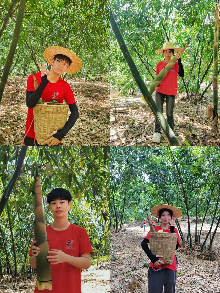 同学们拿着砍刀和篮筐,享受劳动的快乐,小心地寻找地里较成熟的麻竹笋。当收获大大的麻竹笋,就能听到周边同学的欢呼声。没过多久,竹篮都被装得满满当当。