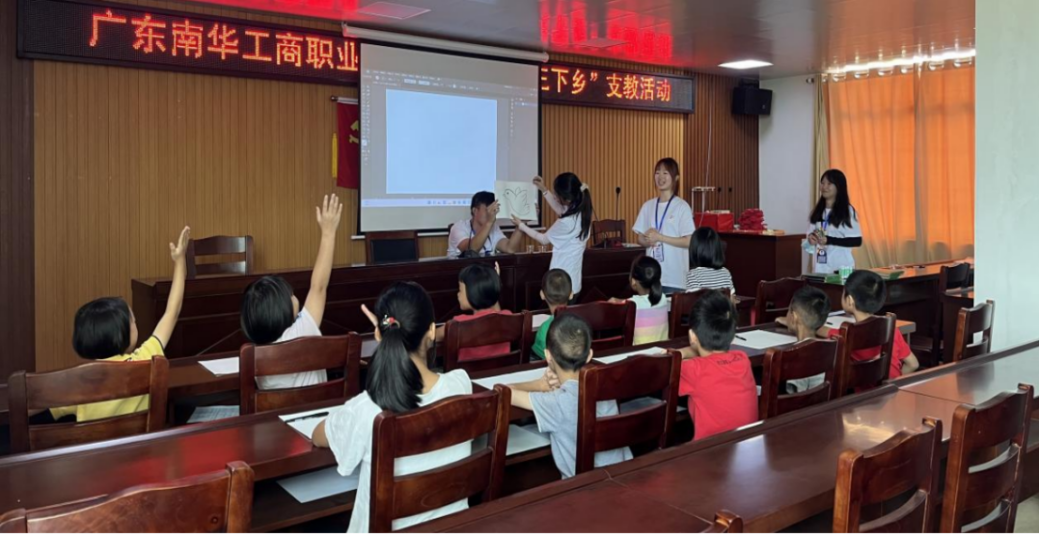 美术教学组结合专业特色,践行专业所学,开展美育教育,与石望镇新和村的孩子们一同绘画。每个孩子都在认真绘画出自己心目中的家乡蓝图。队员们将爱国主义教育融入美育的方式,让孩子们在接受艺术教育的过程中潜移默化感受到爱党、爱国、爱家乡的思想熏陶。