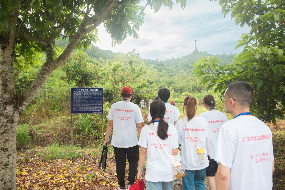 最后,“红心向党,筑梦前行”社会实践队在文化站站长蔡志能的带领下,来到了铁屎迳铸钱遗址。在前往铁屎迳铸钱遗址的路上,蔡站长为我们讲述铁屎迳铸钱遗位的历史文化。该遗址是目前所知唯一一处十国南汉时期铸造铅钱的工业遗址,对研究中国的钱币史、南汉币制和南汉刘龑王朝经济状况提供了重要的实物史料,同时是国家重点文物保护单位。在聆听了蔡站长的讲解以及触摸遗址上残留下来的铁渣后,我们感受到了石望镇历史底蕴的深厚,也感受到了古人的智慧与匠心。