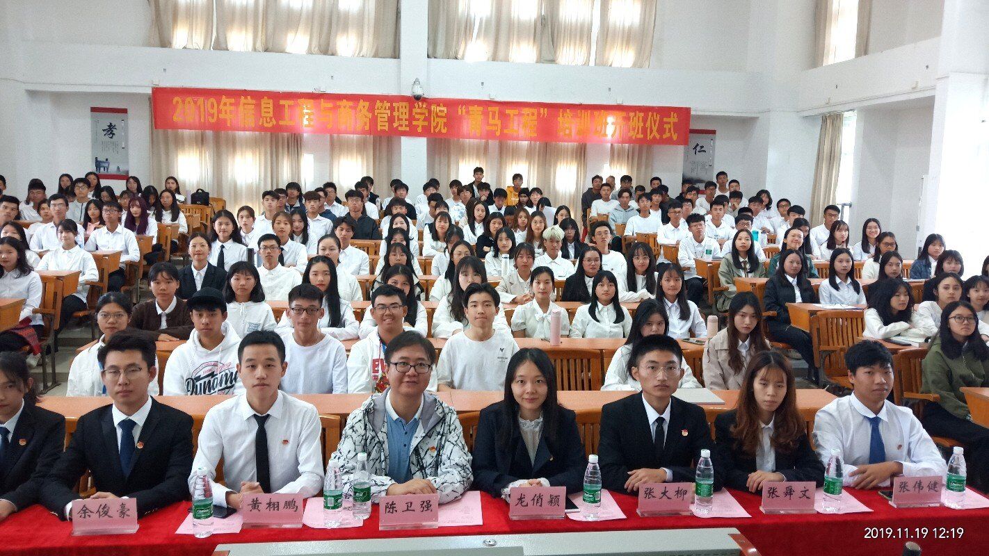 为了加强我院学生干部骨干队伍的培养力度,深入推进我院学生干部“青马工程”工作,深化“青马工程”的育人功能,使我院学生干部队伍更有效率投入到学生组织工作之中,信息工程与商务管理学院于2019年11月19日12:10分在教学楼301举行“青马工程”培训班开班仪式。参与本次开班仪式的有:信商学院团委书记陈卫强老师、信商学院团委副书记龙俏颖老师、以及19级各班的班长、团支书、组织委员和信商学院团学全体学生干部。