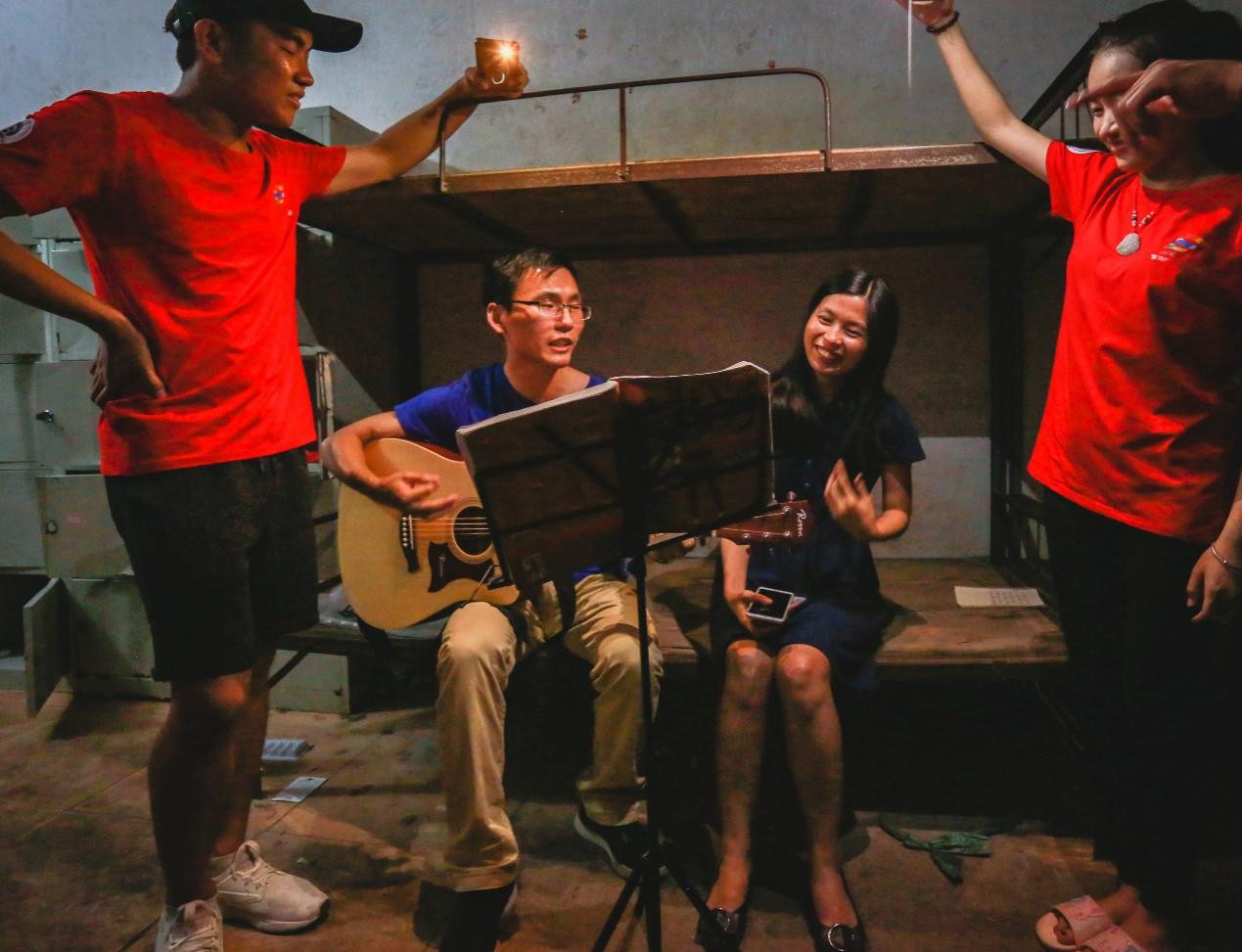 下午5:00,博雅信商实践队顺利完成制定的调研计划,到镇政府用晚餐。队员们虽然身体已经极度疲惫,但在回到桥头镇中心小学的住宿地后,马上对这两天调研所搜集到的数据进行汇总及分析。在完成数据汇总和分析后,大家继续排练文艺汇演的节目。排练期间,镇政府办公室、镇国土规划所的干部带着慰问品来到中心小学探望队员们。队员们对镇政府工作人员的探望表示了衷心感谢,并与镇政府工作人员进行了一场即兴的“演唱会”。大家以音乐会友,在欢快的吉他声中一起高歌友谊之曲。