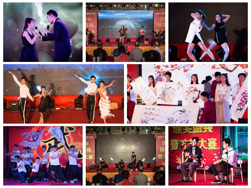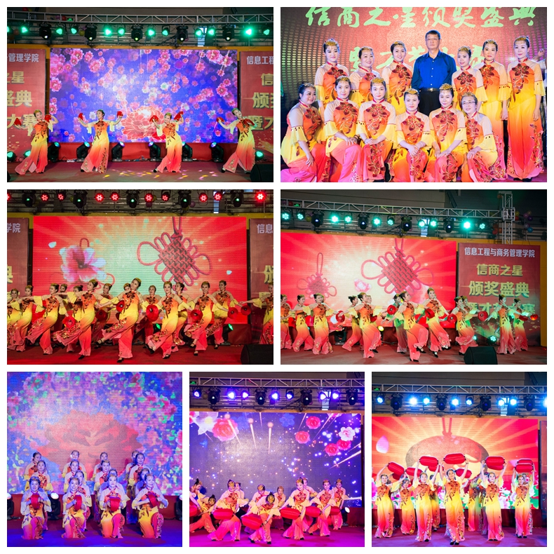 紧接着是各领导老师为智慧之星、自强之星、服务之星、创业之星、竞技之星、公益之星、团队之星、成就之星进行颁奖。在颁奖的过程中,穿插进行才艺大赛的乐队表演、街舞表演、吉他弹唱、武术表演、爵士舞、双人合唱、风采绘画等节目为老师和同学们带来了精彩的视觉盛宴。其中,校企合作单位大益集团友情为我们带来了茶艺表演《当旗袍遇上茶》,在轻缓古典的背景音乐与茶艺介绍中,茶艺表演者向大家展示了泡茶的过程,一举一动间,仿佛能感受到古时人们品茶作诗的闲适悠然以及蕴含的茶道文化。信商学院女老师们《欢聚一堂》的舞蹈表演,更是引爆了全场,赢得了全场雷鸣般的掌声与欢呼声。