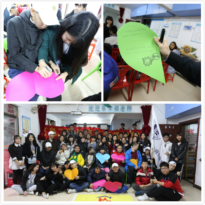 第二站是慧灵机构服务中心,这一站的们一个时刻都难以让我忘记,不管是我们还是他们,都在学习,都在用他们的心在沟通。去慧灵之前,我们信商团学为他们准备了他们喜欢并且会唱的歌唱表演,和人偶表演及游戏互动,到最后的卡纸祝福环节。让我第一印象最深的是他们的热情,让我感受到他们渴望交到更多的朋友,渴望接触社会。当我们走到慧灵机构活动室的门口时,他们有序的坐在座椅上欢笑着向我们伸手握手,这一幕我们永远也不会忘记;我们进入活动室与他们坐在一起,有一位学员我们进行了3个小时活动,他的双手握着我们3个小时,他们都渴望被关爱,都渴望能交到更多的朋友,都渴望像其他人一样快乐的生活。有些学员天生有说话障碍,肢体障碍,智力障碍,甚至精神障碍,但是在人偶游戏活动中,机构的学员们上台歌唱,上台表演手语表现自己,他们积极、自信、向上;是需要我们向他们学习的地方。我们准备了一些夏天他们做活动需要用的帽子作为礼物送给他们,在最后卡片祝福环节,我们团学干事与慧灵学院手把手在卡纸上写上了祝福,加油的话语。每一幕,都是让人值得学习的,我们不会忘记3月10日这一天所有的经历,我们不会忘记这一天的意义。