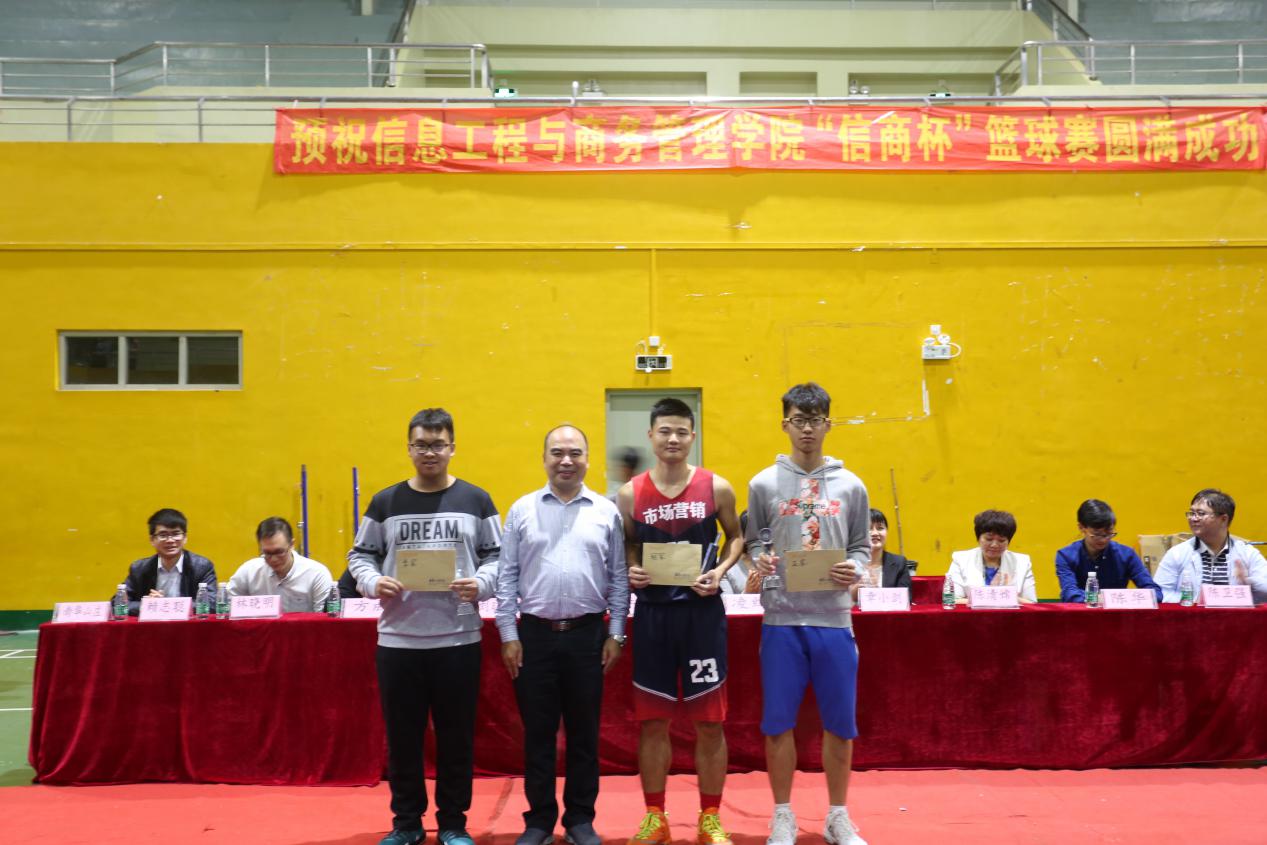 大会伊始,信息工程与商务管理学院李新院长上台发表讲话,李新院长对“信商杯”篮球赛的完美落幕表示热烈祝贺,并对参赛的选手表示要再接再厉,戒骄戒傲。接下来进行颁奖仪式,由主持人宣布比赛队伍获奖名单。接下来分别是邀请章小剑老师为三分球大赛第一第二名颁奖并合影留念,紧接着邀请刘晓玲老师为季军颁奖并合影留念,紧接着有请党支副书记凌红书记为亚军颁奖,紧接着有请李新院长为冠军颁奖。最后,所有领导老师与获奖运动员一起上台签字并合影留念。