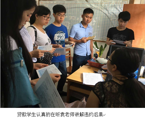 会上,袁老师以过去一个同学因贷款逾期未还最后导致买房出现重重困难的例子,强调了诚信还款的重要性,希望同学们按期归还本息,珍惜个人诚信,不让人生留下污点。 同时也希望同学们能珍惜国家给予的帮助,懂得感恩,不管将来去到那里,都不要忘记自己是一名南华人的身份,将来有所成就能汇报社会,能做到常与学校、老师联系。
