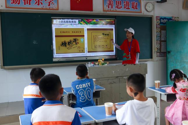 7月10日上午,红心实践服务队精心策划了三项支教活动,分别是“活力启航”“美丽家园我行动”及“健康食品安全”。支教组成员陈润琪设计了“切西瓜”游戏,寓教于乐,既提升了同学们的反应能力,也锻炼了他们的身体素质。另一位成员丘芷晴则巧妙运用短视频展示与有奖竞答形式,让同学们深入学习了垃圾分类的要点、食品安全四要素以及饮料制作流程等实用知识。这些活动不仅拓宽了同学们的视野,还深刻阐述了保护环境的重要性,同时增强了他们辨别真伪、识别优劣的能力。