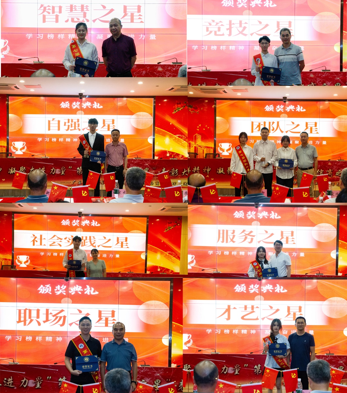 表彰大会前通过个人申请、他人推荐、班级推荐,经信商学院第七届“信商之星”评审委员会审核、公示无异议后学院党政联席会审议,最终决定授予21级工商1班罗亚丽“智慧之星”称号、22级计网班沈智华“竞技之星”称号、22级软件2班叶帝凯“自强之星”称号、信商学院团委青年志愿者中心“团队之星”称号、21级高本电商班李智“服务之星”称号、21级工商1班叶舒云“社会实践之星”称号、16届药品1班吴耿帆“职场之星”称号、23级商数2班龙琳玲“才艺之星”称号。
