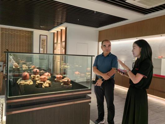 10月16日上午,李新院长一行和校友林培鑫到达裕德堂壶艺研究所,受到“大国工匠”张瑞端大师热情接待。交流中,张瑞端大师介绍了裕德堂壶艺研究所的概况,特别是张泽锋作为第五代传人,既是“全国五一劳动奖章”获得者,也是学校德育导师,在其父亲张瑞端的精心指导下,制壶技艺日渐精湛,所创作的作品屡获大奖。
