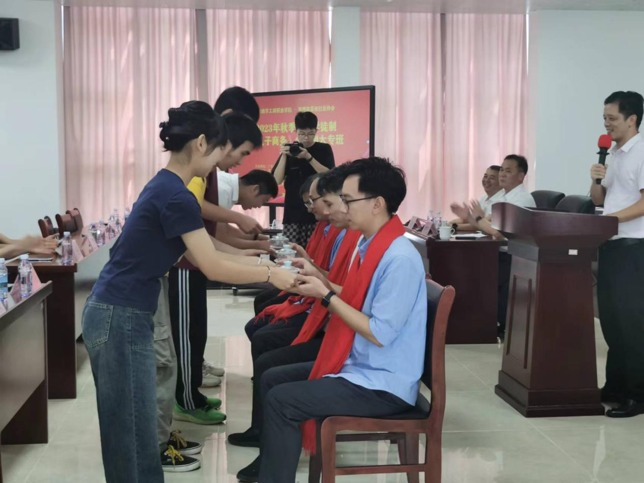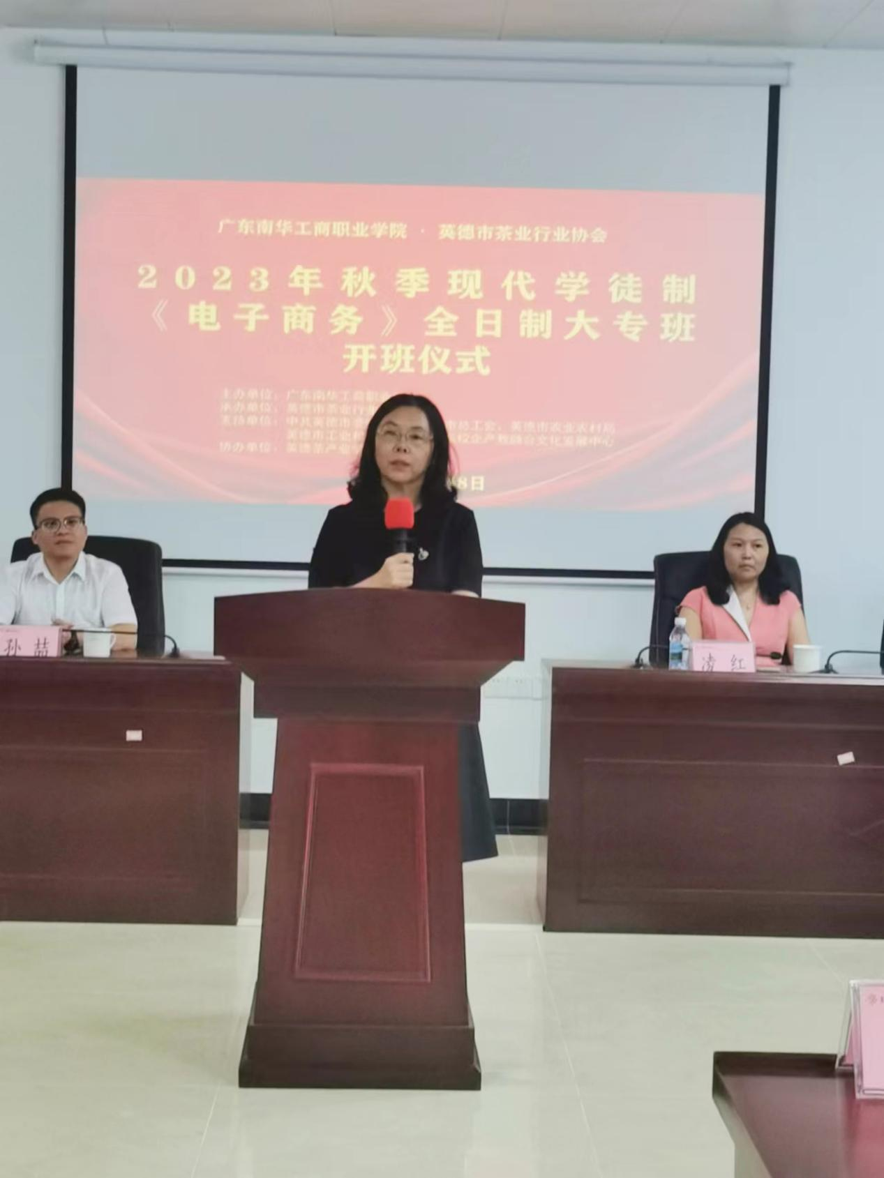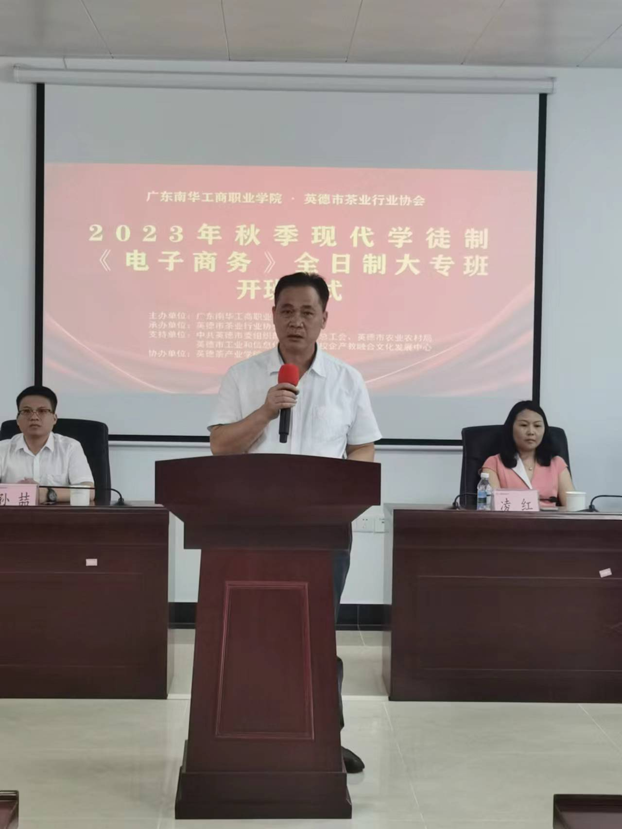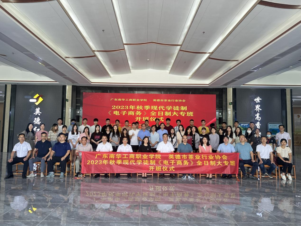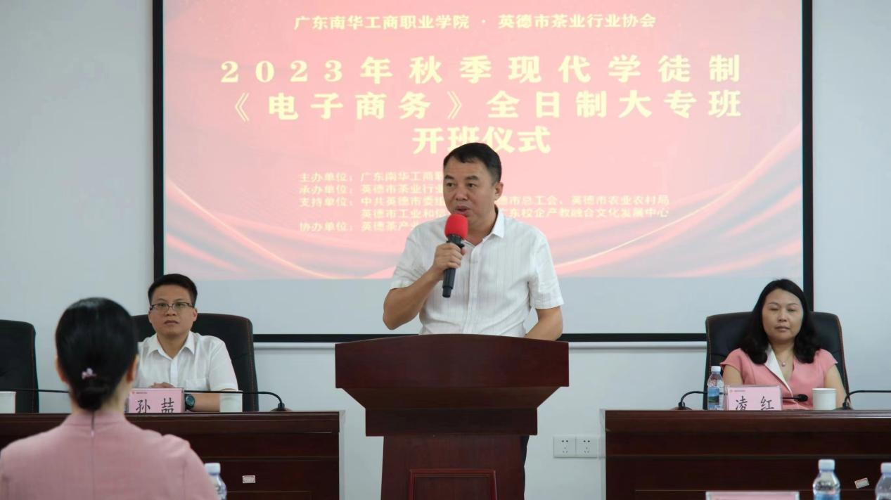 与英德茶业行业协会合作的电子商务现代学徒制班受到英德市政府的高度重视,大家齐聚一起,与45名学徒、4名企业导师、1名班主任、3家企业代表,共同见证这一历史时刻。开班仪式上,英德市茶业行业协会执行会长兼英德积庆里茶业有限公司总经理邓慈寒致欢迎词,邓会长对前来报到的学徒表示欢迎,紧接着举行了庄重的拜师仪式,由4名学徒给企业导师恭敬地戴上红色披巾并敬茶、学生代表发言表示要抓住机会努力学习、企业导师张邦健分析了当前电商行业的发展态势鼓励学徒们积极进取,英德市总工会主席何可造对拜师仪式的场面表达了感动之情,同时表示与高校合作的现代学徒制是提升产业工人学历、技术技能的重要途径,也是政府产改的重要抓手,有助于推动英德茶产业发展、乡村振兴以及英德高质量的发展。最后,我校唐晓林副校长总结发言,唐校首先对45名学徒表示热烈欢迎和衷心的祝贺,并介绍了我校的历史由来以及建设目标,电子商务专业成长为省级二类品牌专业的过程以及与英德茶业协会合作的电子商务现代学徒制班的培养模式,依托英德茶产业学院,打造“政、工、校、协、企”五位一体,培养企业真正需要的高技能人才,助力英德茶产业高质量发展。同时对学徒们提出了寄语,并对参加开班仪式的英德总工会、组织部、工业和信息化局、农业农村局、广东校企产教融合文化发展中心,特别是组织方英德茶协相关领导和工作人员的付出,表示衷心的感谢!