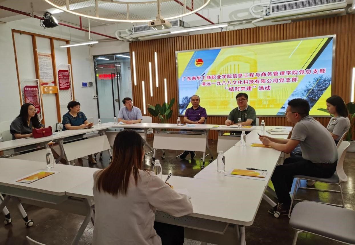 活动开始后,1988实践基地负责人胡小华总经理带领信商学院支部党员老师参观基地的学生的非遗文化设计大赛的文化作品和1988文化科技有限公司支部的党建文化室的建设,随后双方进行座谈会并进行支部共建结对仪式。交流座谈会上,胡总首先全面介绍了1988实践基地发展概况,企业用工情况,专业岗位人才需求状况。随后,信商学院李新院长表示,我们此行的目的,就是全面了解企业用人需求,发挥职业院校服务地方经济发展的职能作用,助推校企校地深度合作,促进毕业生更高质量和更加充分就业。接着,双方就紧扣供需对接、就业育人、校企合作等领域开展了深入的交流。