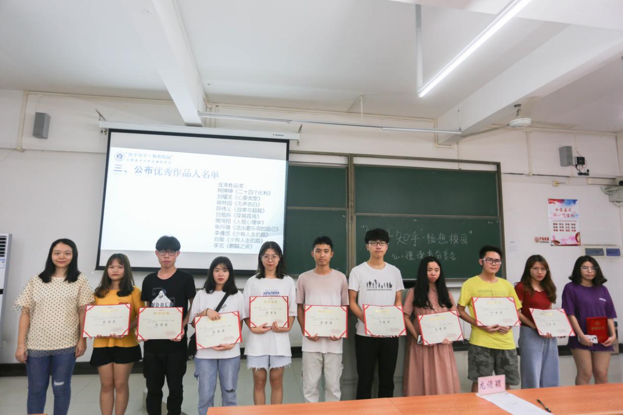 本次活动参与作品共48份,其中16份作品为获奖作品。在活动中,主持人首先介绍本次活动的举办目的,给大家介绍本次活动中同学推荐的心理类书籍;接着,主持人公布获奖作品,龙俏颖老师为获奖者颁奖;接着,是读书心得分享环节,同学们积极、踊跃地上台分享自己的读书心得,气氛轻松愉悦;紧接着,是游戏环节,分别是“心灵不打结”和“心理电影猜猜猜”,同学们在游戏环节中玩得相当尽兴,也借此机会释放心理压力。