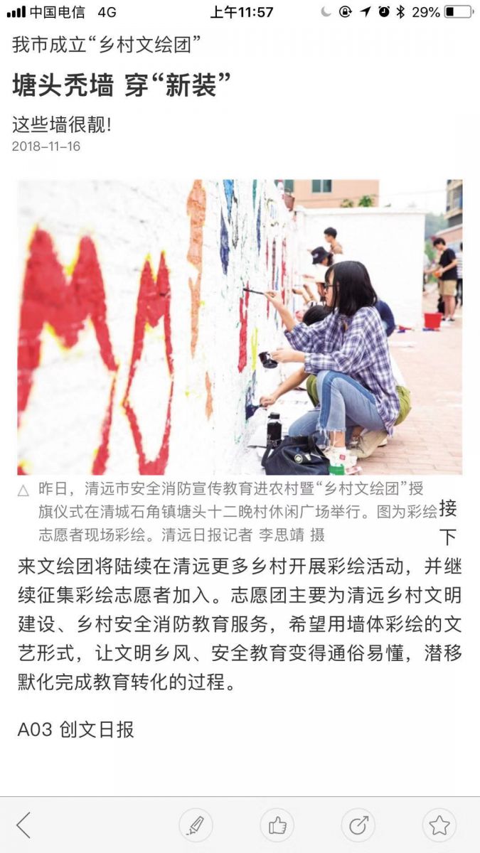 “乡村文绘团”主要为清远乡村文明建设、乡村安全消防教育服务,希望用墙体彩绘的文艺形式,让文明乡风、安全教育变得通俗易懂,潜移默化完成教育转化的过程。