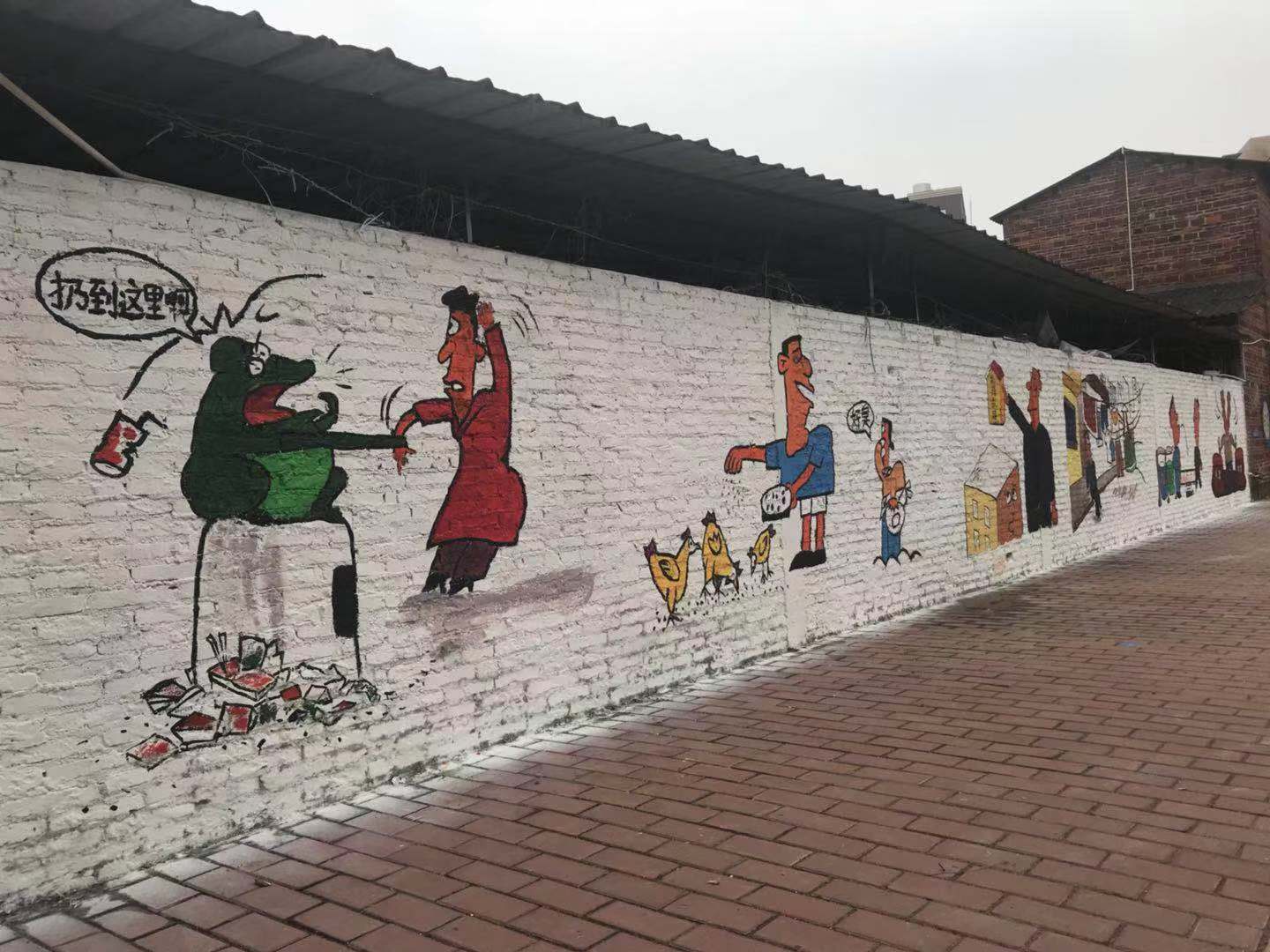 早上9点,在信商学院党总支书记李新、副书记凌红的大力支持和嘱托下,冯圣媖老师带领着数字媒体系19名彩绘志愿者准时赶到塘头十二晚村绘画地点准备绘画。一个上午的时间,村里两面约20米原本光秃的墙面,很快就焕然一新,化身成为乡村安全、文明宣传栏。绘画内容包括消防安全漫画、清远乡村文明十二条漫画等。如,不随便说脏话,不随地乱丢垃圾、不铺张摆宴席等。