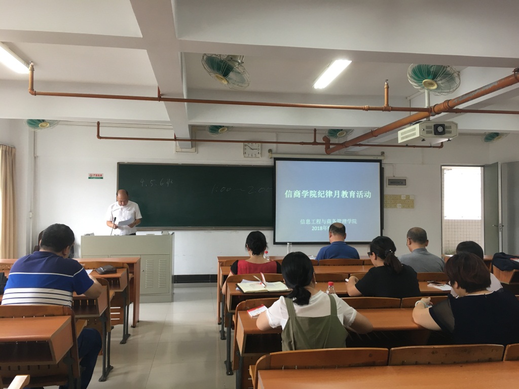 9月21日信商党总支按照学校纪委关于《关于开展 2018 年纪律教育学习月活动的通知》的要求,召开全体教职工大会,传达纪律学习月活动的通知的精神和要求,并对相关学习材料进行了集体学习。会议由信商党总支副书记凌红主持。