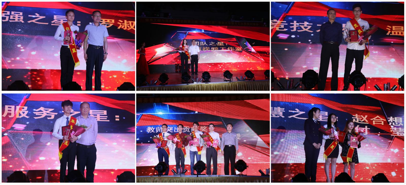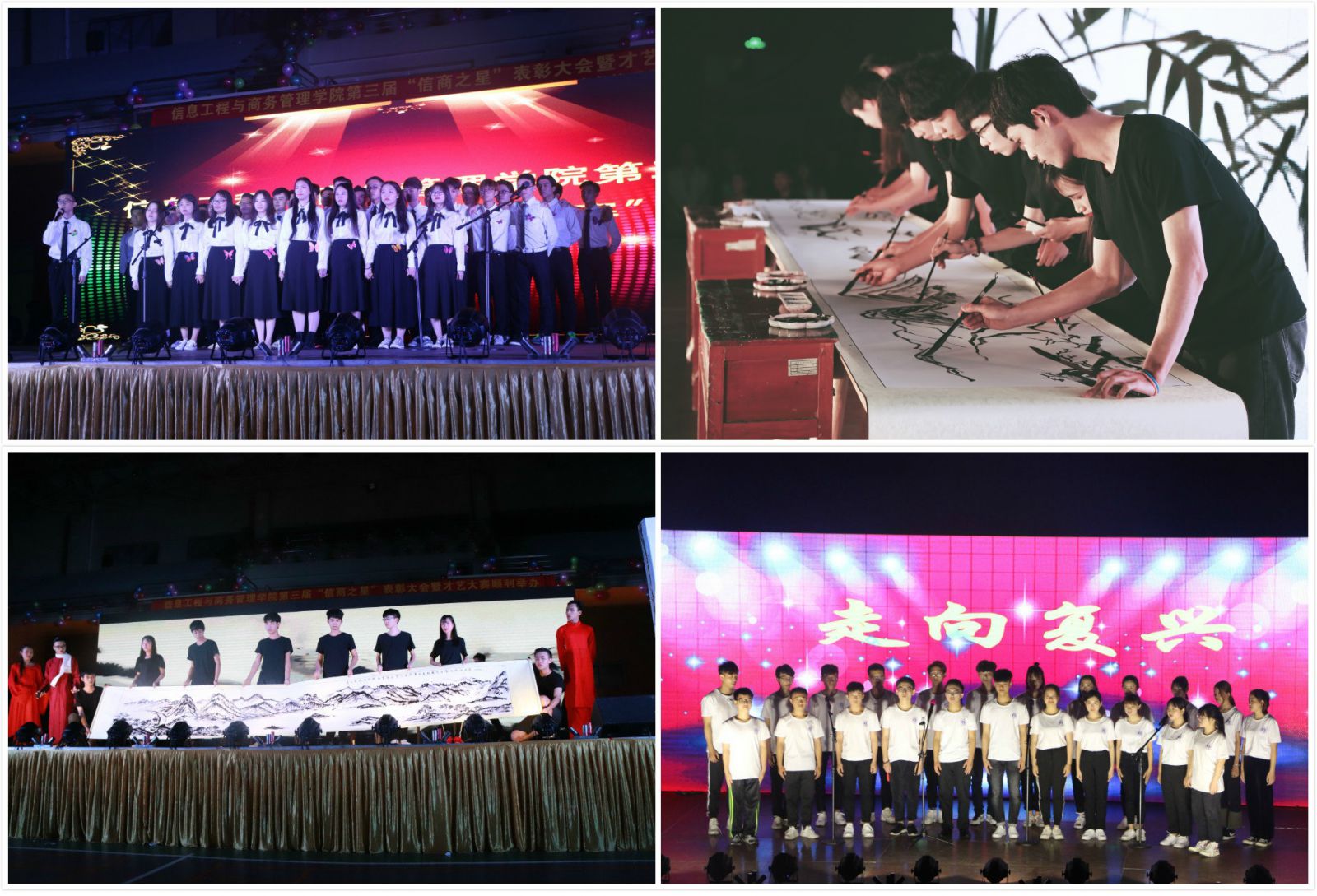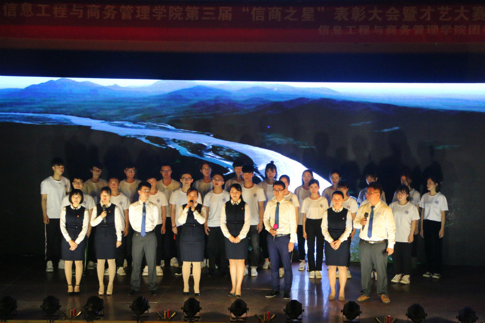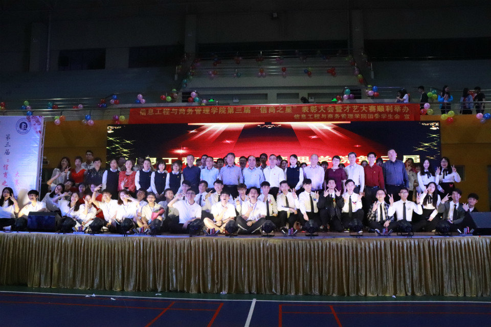 高举习近平新时代中国特色社会主义思想伟大旗帜,深入学习宣传贯彻党的十九大会议精神,全面贯彻落实全国高校思想政治工作会议精神,落实立德树人根本任务,培养德智体美全面发展的社会主义建设者和接班人,弘扬社会主义核心价值观,发挥新时代大学生先进典型的示范引领作用。信息工程与商务管理学院于2018年4月26日晚上19时在清远校区体育馆隆重举行了第三届“信商之星”颁奖盛典暨才艺大赛。9999js金沙老品牌党委委员、副校长王满元,校学生处处长、武装部部长张朝山,校组织宣传部副主任梁萍萍,校团委书记余喜文,校学生处副处长胡娟,信商学院党总支书记、院长李新,信商学院常务副院长肖伟、副院长刘杰、党总支副书记凌红、办公室主任邱州鹏、各个专业系主任、各二级学院团学指导老师以及信商学院全体师生2200多人出席了本次活动。
