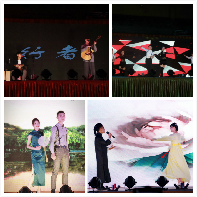 紧接着是各位领导与老师为智慧之星、团队之星、服务之星、自强之星、竞技之星、才艺之星以及教师突出贡献奖获得者进行颁奖。在颁奖的过程中,穿插进行才艺大赛的拉丁舞表演、男女合唱、吉他弹唱、集体大合唱、风采绘画等节目为老师和同学们带来了精彩的视觉盛宴。其中,信商学院全体辅导员们为大家带来了一首自创的诗歌朗诵《我们的南华梦》,以抑扬顿挫、慷慨激昂、铿锵有力、声情并茂的朗诵向大家生动地描绘了一幅南华人追求南华梦的美好画面,赢得了全场雷鸣般的掌声与欢呼声。