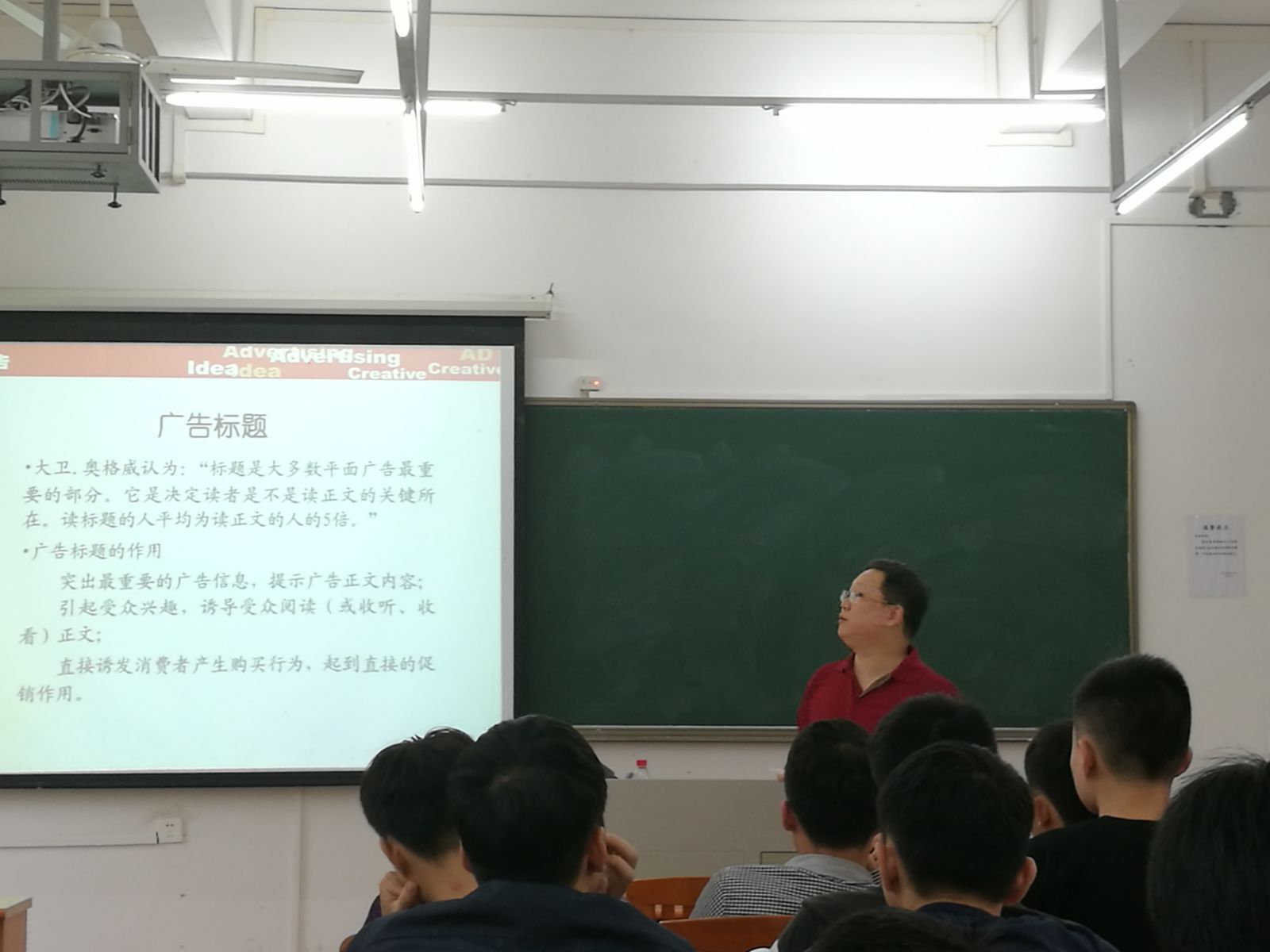 课上,彭韬老师以保险公司广告语为切入,引出了主旨内容“广告标题”,同时以“广告教父”大卫·奥格威对标题的定义为展开,向在场的老师和同学们逐一详解了十四种常见的广告标题表现形式。运用各种贴近生活的案例,彭韬老师以他幽默的话语,让学生在享受课堂,享受学习的过程中对关键的知识点有充分的理解和吸收。这是在老师身上散发出的工匠精神,是对工作的一丝不苟,对学生的认真负责。