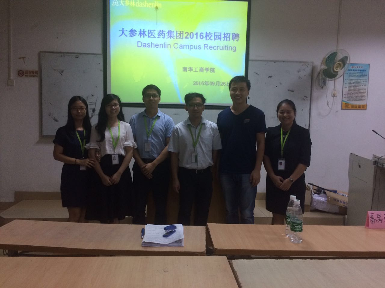 2016年9月26日下午,大森林医药集团在我校黄埔校区8栋101教室进行现场宣讲和招聘。此次招聘对象为我系2014级医药营销、药品经营与管理和公共营养师的学生,招聘岗位为顶岗实习。参加此次宣讲会的老师有信商学院药品经营与管理专业胡元利老师与蒋丽芸老师。