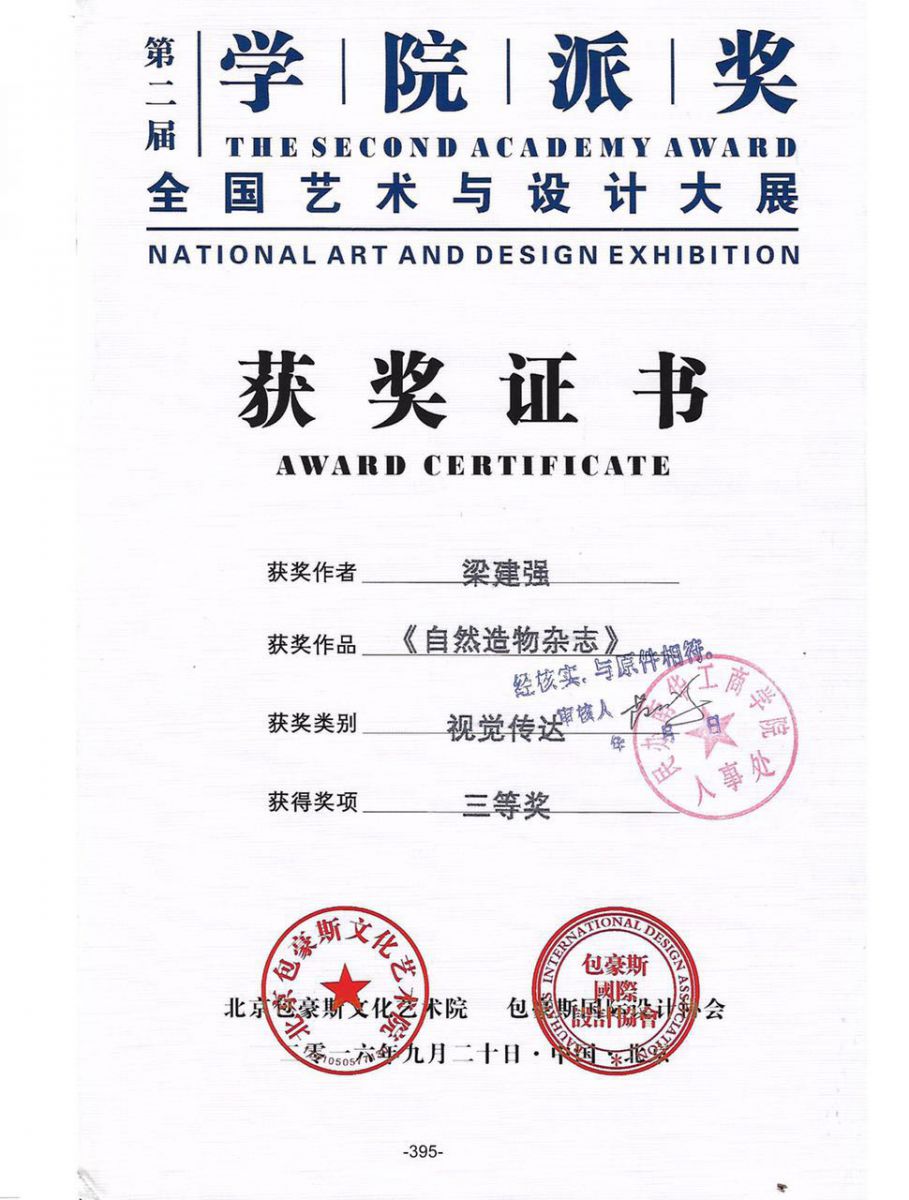 近日, 第二届学院派“全国艺术与设计大展”获奖结果揭晓,我专业学生梁建强的设计作品《自然造物杂志》获三等奖,另有入选奖若干,冯圣媖老师获优秀指导教师奖。
