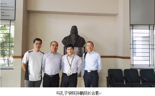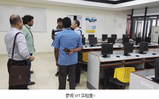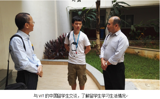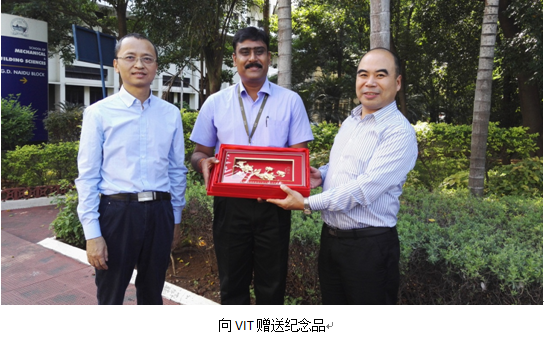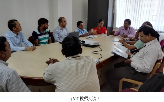 第三天从新德里飞到二千多公里外的南部金奈市,随即转往130多公里外的南部小城韦洛尔,休息一个晚上后次日一早赶往韦洛尔理工大学展开第二场考察。韦洛尔理工大学学术氛围浓厚,绿树成荫,被称为印度最漂亮的大学,设有7个学院,17个本科专业,28个研究生专业。学校办学面向世界,与国外很多的机构保持密切的联系,培养模式与国际接轨,据说该校的毕业生每年有30%被世界知名企业录用。我们在校园里偶遇一位国内留学生,交谈中了解到这所大学要求非常严格,上课玩手机将被没收,两科以上不及格将被开除,理工学生如果没有做项目将不能毕业。国际交流中心的Dr.M.Subaji接待了我们,带领参观校园,安排与计算机老师举行座谈。印度目前唯一一所孔子学院设立在VIT,孙鹏院长象亲人般热情接待了我们,通过他快速拉近与VIT的距离,最后双方达成合作意向。
