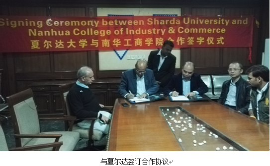 第一天飞抵印度首都新德里入住酒店已近晚上十二点(北京时间凌晨二点半),第二天一早便乘车前往新德里东南四十多公里的夏尔达大学考察交流。新德里污染严重,空气中弥漫着刺鼻的气味,道路上各种车辆拥挤不堪,但丝毫阻档不了国际访客的热情,与我们一同出现在校园里的还有日本考察团和德国考察团,这与在机场很少见到外国人形成反差。夏尔达大学是一所经印度政府大学资质认证委员会 (UCG)认可的私立大学,在校生两万多人,设有工程技术学院、商学院、牙科学院、医学研究学院、法学院、语言学院、综合科学及创意艺术学院等7个学院。由于印度IT世界闻名,我方重点与信息工程技术学院负责人及老师们进行了合作洽谈,校方非常重视与我们的合作,经过一整天多轮谈判,下午6点达成合作意向,双方签订合作意向书,最后该校的副校长Dr. Vijay Gupta接见了我方人员及德国的考察团。