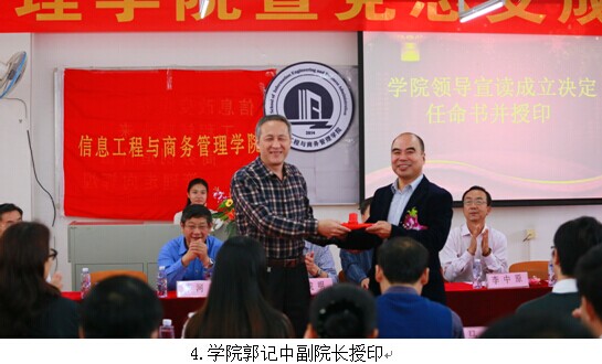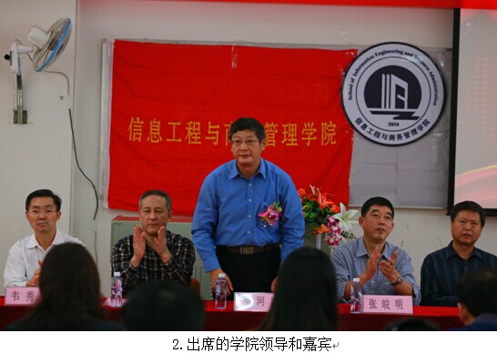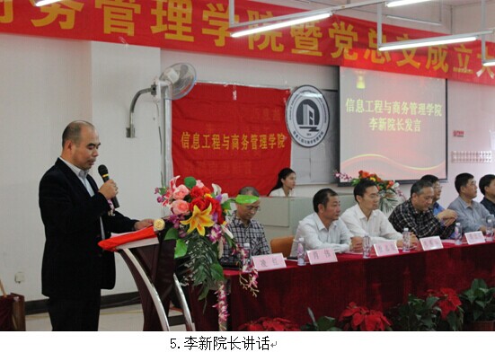在庄严的国歌奏响过后,学院郭记中副院长宣读信息工程与商务管理学院成立的决定、任命书并授印。接着李新院长代表信商学院发表了《继往开来开拓创新 共同促进信息工程与商务管理学院的发展》的讲话。他讲述了信商学院成立的经过,介绍了“信息改变世界,工程铸就未来,商务创造价值,管理走向辉煌”的愿景和着力培育横跨商务和信息技术的复合型两栖人才的教学理念;对学院领导、校企合作单位、教师都表达了衷心的感谢。因此有理由相信,在新的领导集体的带领下,信商学院全体老师和学生将迈上新的征程,走向辉煌!