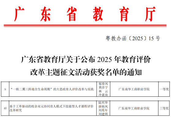 近日,广东省教育厅公布了2025年教育评价改革主题征文活动获奖名单,我校报送的《“一核二翼三阵地全生命周期”的大思政育人评价改革与实践》获高等职业学校组一等奖(全省一等奖10篇),《基于工单驱动的校企双元协同育人模式下技能型人才课程评价改革研究》获三等奖。