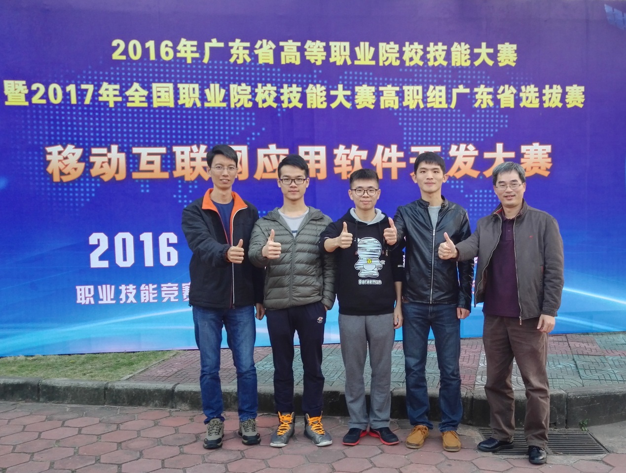 教务处及信商学院对此赛项非常重视,在人员、设备、训练场所等方面提供有力保障,指导教师杨家成、刘万授把比赛与他们主讲的移动应用开发、Java Web应用开发课程相融合,早在一年前就开始组队训练:先夯实Android编程基本功,再通过承接财经学院的“会计考证APP”项目,以及成功申请到“攀登计划”广东大学生科技创新培育专项资金项目强化选手的实际项目开发应用能力培养。同时通过校企合作邀请企业专家对学生进行实战指导,赛前对团队配合及各种情况进行充分演练。为此指导教师和三位参赛同学耗费了大量业余课余时间备赛,成绩确实来之不易。当然,成绩的取得也得益于信息技术专业群多年推行的基于工作过程项目化教学改革实践,是该专业群老师们合力打造的结果,这也将极大增强并坚定他们继续搞好专业建设提高人才培养水平的信心。