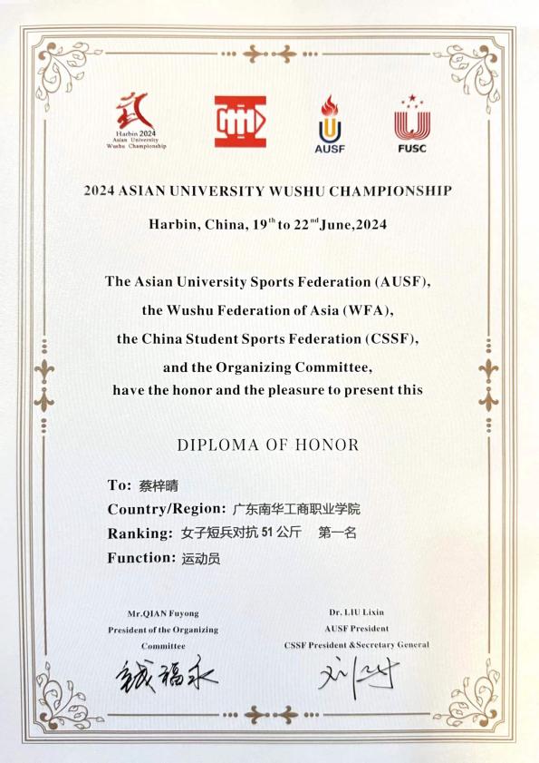 6月22日上午,我校选手蔡梓晴以17:15击败北京体育大学选手李钦海,荣获2024年亚洲大学生武术锦标赛短兵51公斤项目冠军! 图1 蔡梓晴选手荣获冠军 2024年亚洲大学生武术锦标赛是首届亚洲大学生洲际武术比赛,由亚洲...