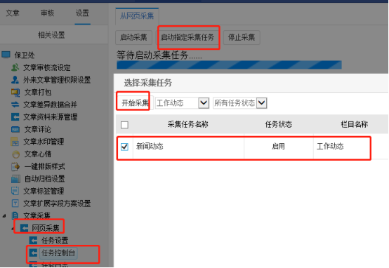 任务控制台——启动指定采集任务——勾选任务——开始采集